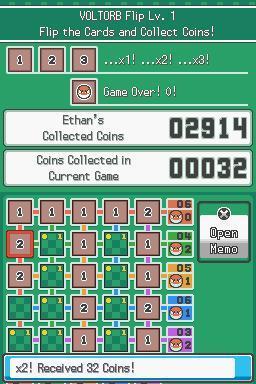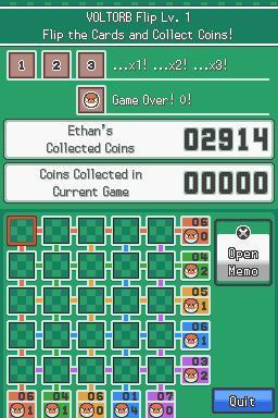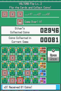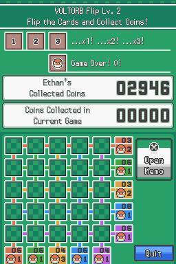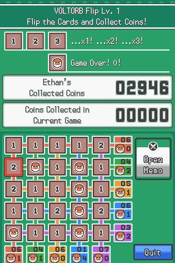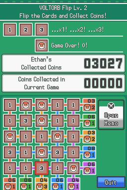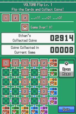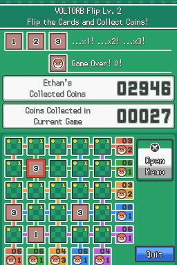 选择下屏右上角的“Open Memo”或者按DS上的“X”键就打开了标记牌功能,使用该功能可以将未翻开的牌标记为“1”、“2”、“3”或“雷电球”。需要注意的是标记的时候一定要打开标记牌功能(下屏右边会出现标记菜单),否则就是翻牌的操作。