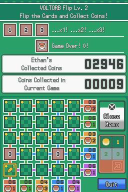 游戏进行过程中如果选择下屏右下角的“Quit”,该局游戏就会退出,当前硬币数就会存到硬币盒中。所以说当游戏进行过程中感到困难时,可以选择退出见好就收,以免不小心翻到雷电球导致白忙一场。