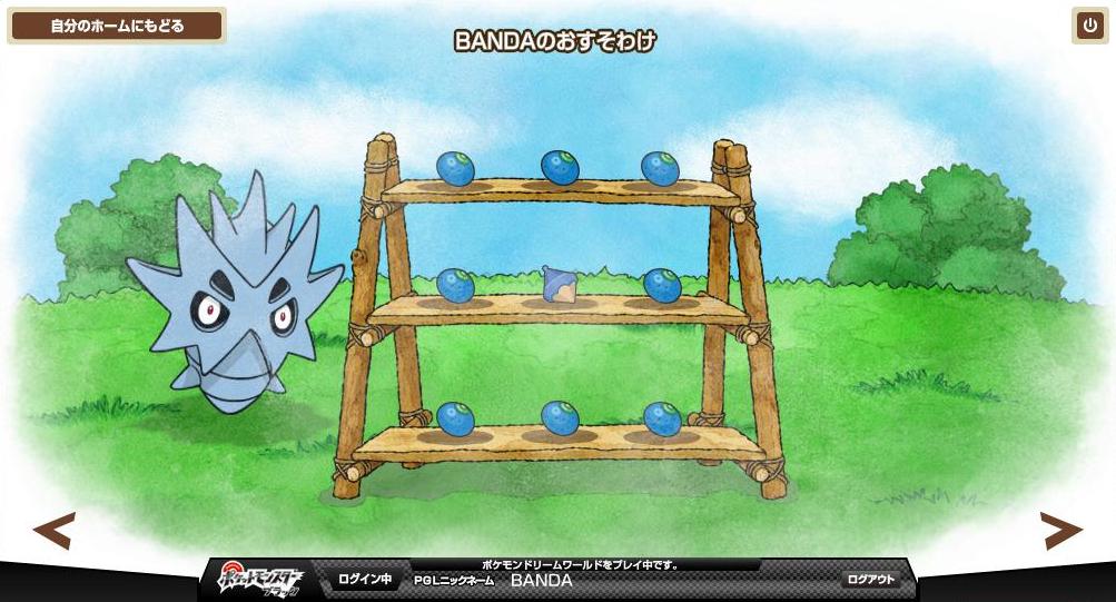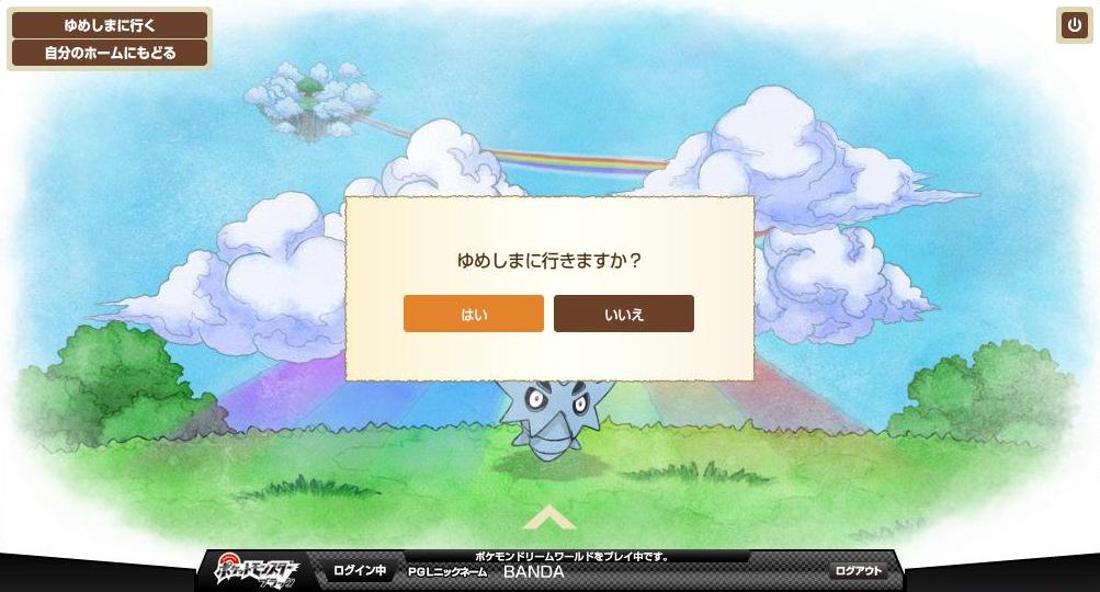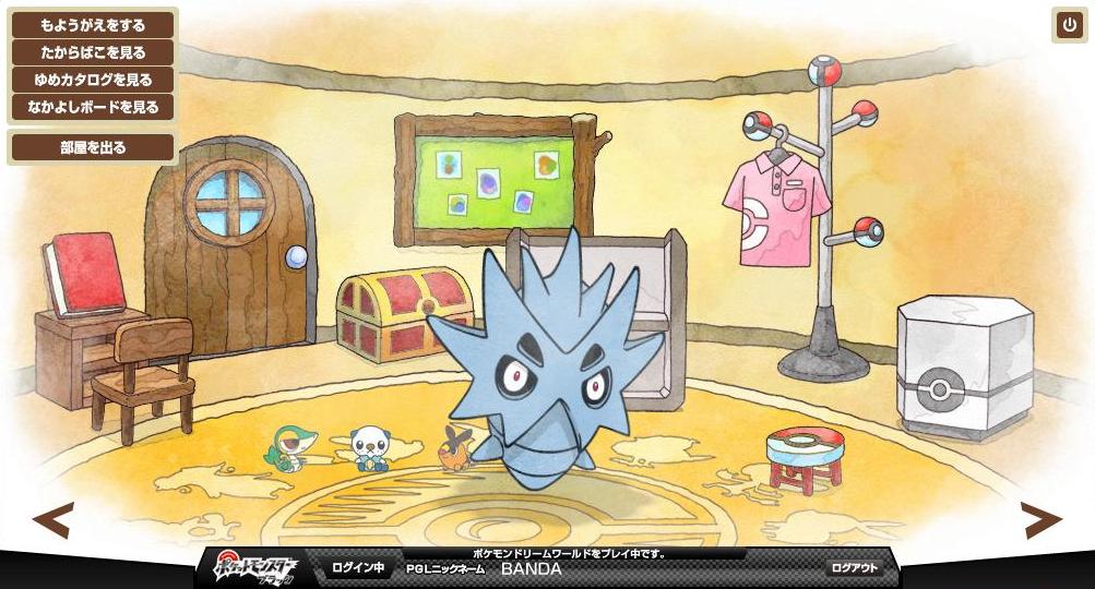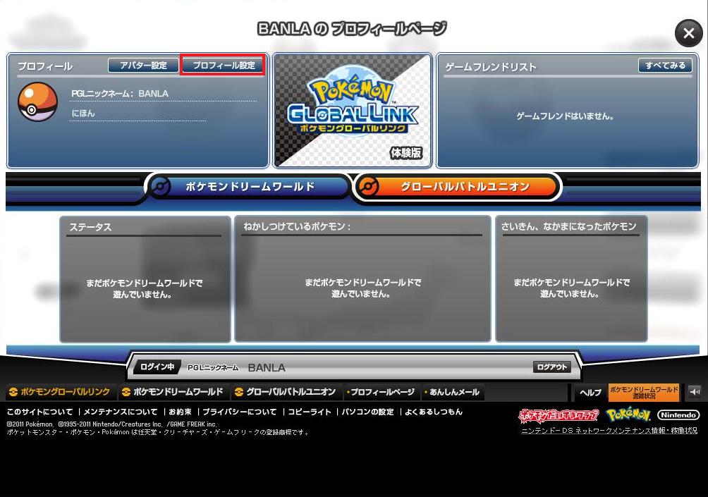 プロフィールページ 个人资料页 アバター設定:更改头像 プロフィール設定:如果同时绑定了黑白两个版本的话进入后选择第二项可以进行版本切换 ゲームフレンドリスト:好友列表 左下显示梦点数、就寝时间、自家外形 中下显示就寝PM的基本资料 右下显示最近从梦世界带回的6只PM