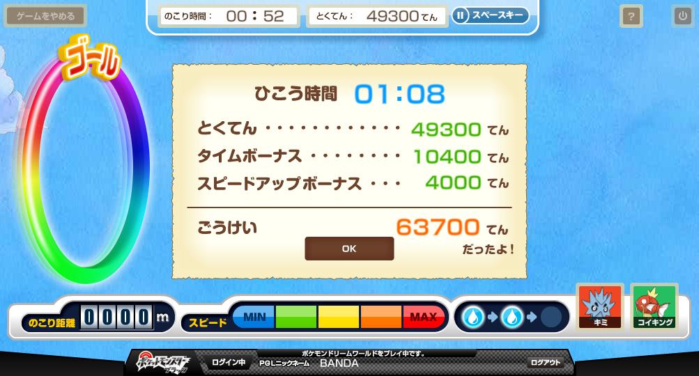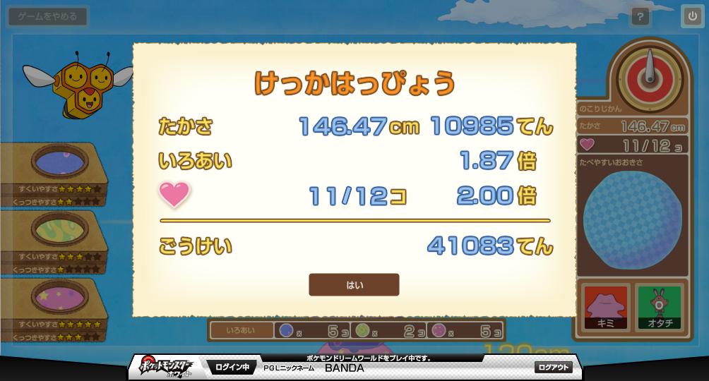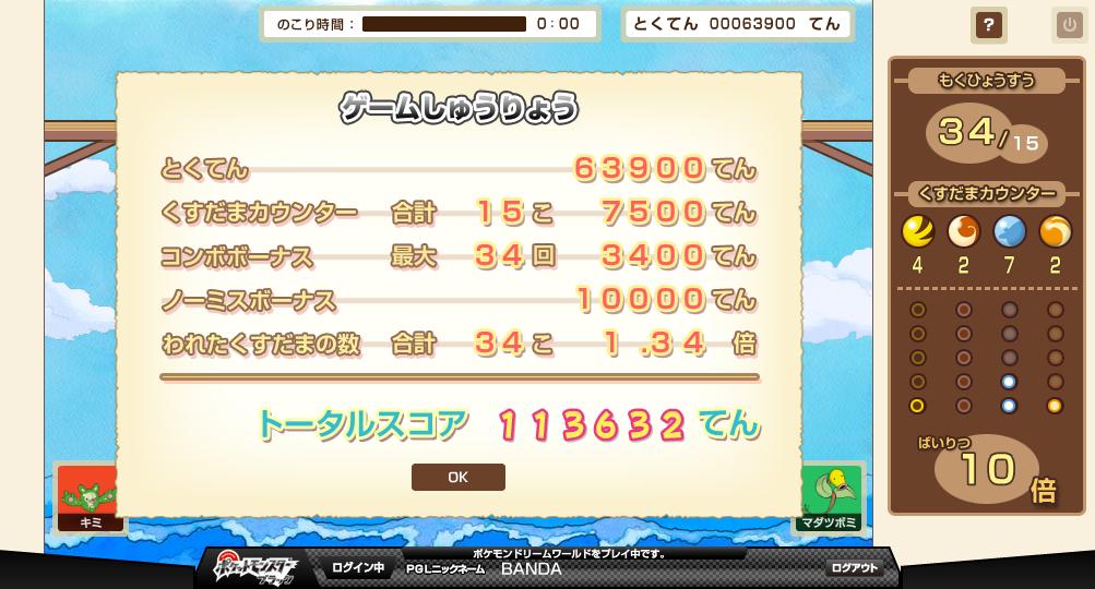 吼鲸王喷水 时间限制:1分30秒 目标:消掉15个球 移动吼鲸王接住掉下来的PM,点击后可以喷水使PM弹到空中 剩余时间1分25秒,1分0秒,0分30秒时分别会增加一只PM 同一类球每被撞击一次就会点亮一盏灯,满五盏后清零且倍率+1,倍率初始为1,上限为10 撞上与PM对应的球可以消掉并得到分数并积累倍率,撞上非对应的球PM只会积累倍率 消掉对应的球的得分为300*倍率 如果完成游戏后没有PM掉入水中则得分+10000