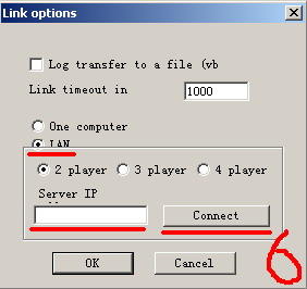 打开VBALINK,在Options菜单里有个Link选项,打开它。(如图6) 选择LAN,在下面的player里选择玩家的人数,在Server IP里填入上面创建服务器时得出的IP地址,点击Connect就可以链接到服务器了。(此时在vbaserver.exe里可以看到有玩家登陆)