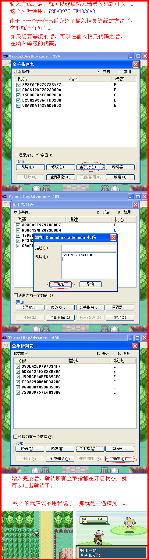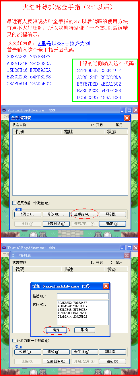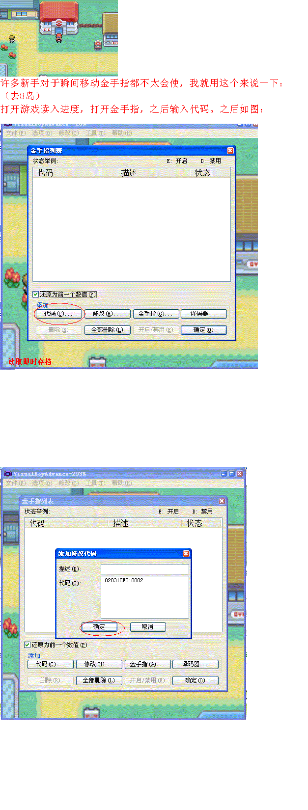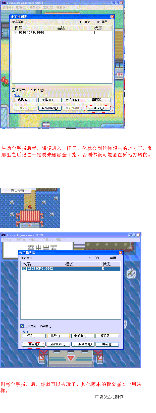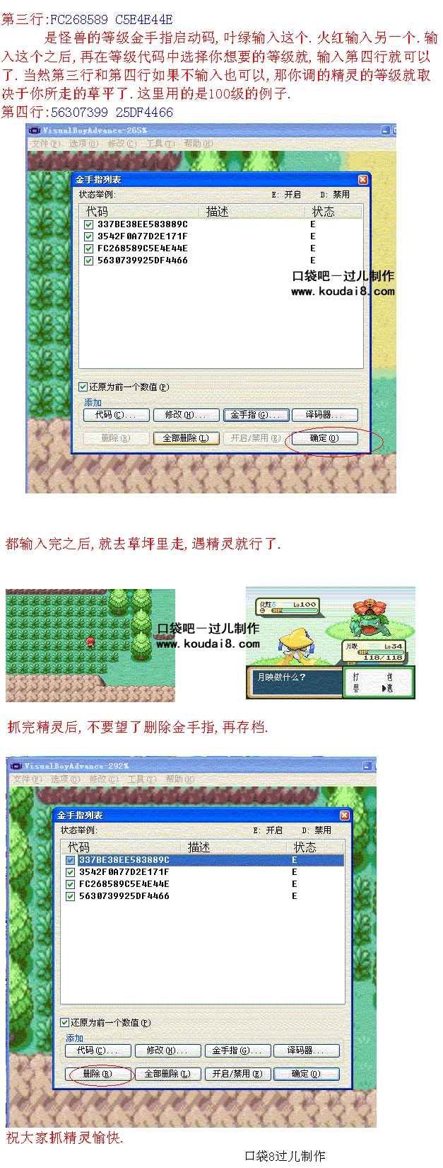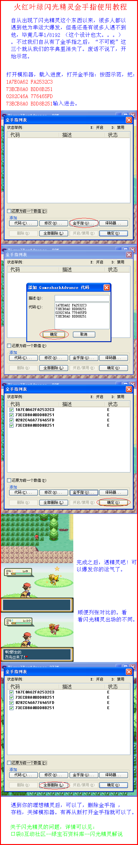 火叶金手指使用教程代码来源:<火叶绝全金手指>还有怪兽金!:http://www.koudai8.com/newbbs/vi ... &extra=page%3D2第一个:火红叶绿抓宠金手指用法示意(附件1--2) 第二个:火红叶绿抓宠金手指用法示意(251以后使用)(附件3--4) 第三个:火红叶绿瞬间移动金手指使用示意(附件5--6)第四个:火红叶绿买道具金手指用法示意(附件7)第五个:火红叶绿闪光金手指用法示意(附件8)