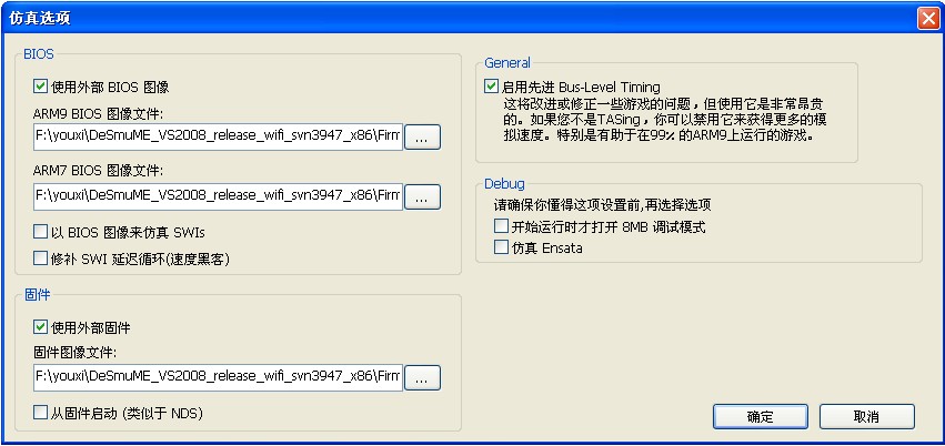 把BIOS 图像文件(ARM9 & ARM7)和firmware image分别指向这三个文件(biosnds9.bin,biosnds7.bin,firmware.bin)。