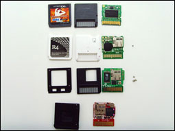 哈哈,这就是众卡“裸照”。最上面是DS正版卡带,其次是R4,稍下是ACEKARD(ACEKARD需要将正面的胶纸撕开才能露出其4个镙丝),最下面则是SC-DS。